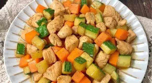 锅中滴一滴油,将鸡丁炒至变色即可盛出,胡萝卜丁用少许油煎两分钟左右,加入蒜末炒香。他被释放了。