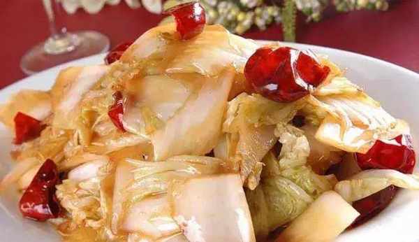 3、锅中倒入植物油,加热至60%热。放入干红辣椒片翻炒片刻。待香气散出后,淋在白菜上,盖上盘子,用文火炖20分钟,淋上香油拌匀。