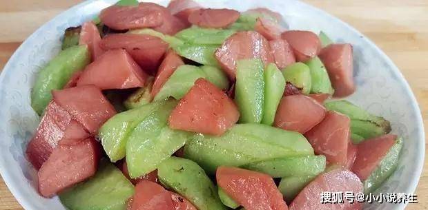 2、锅中油烧热,倒入黄瓜片翻炒,倒入火腿肠片继续翻炒,最后加入适量鸡粉。剁椒酿鸡块