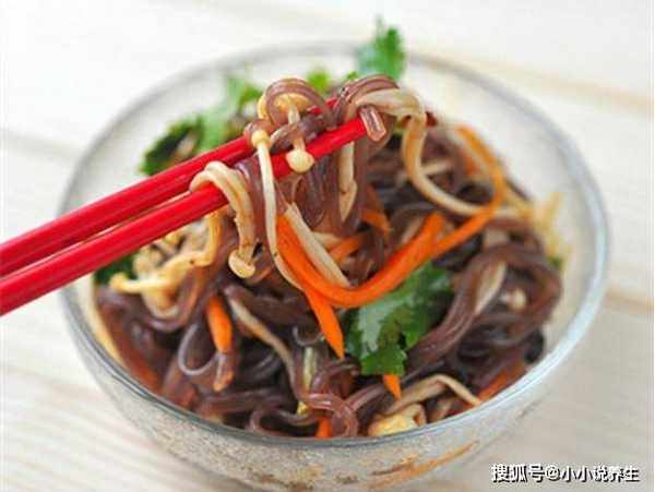 4、倒入金针菇和胡萝卜丝,焯水约一分钟,捞出;5、粉丝捞出沥干,与金针菇、胡萝卜丝、香菜段一起放入大碗中,加入酱油、生抽、醋、香油拌匀。