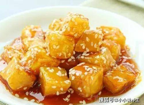 4、倒入炸好的红薯,摇动锅让糖汁均匀的覆盖红薯,关火,装盘撒上芝麻。晶莹剔透,甜软香香,这款蜂蜜烤红薯还有美容养颜的功效