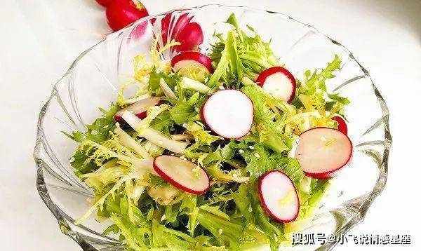配料:苦菊200克、樱桃萝卜50克、白芝麻、亚麻籽油、酱油、盐、陈醋