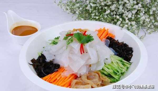 1.海蜇皮去咸味,切丝,焯水,用冰水冲洗干净。