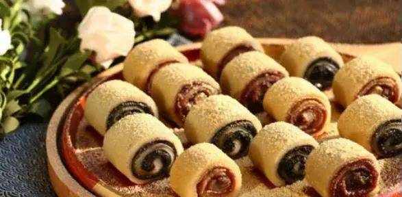 8.从一端卷成卷,在外层均匀撒上黄豆面。