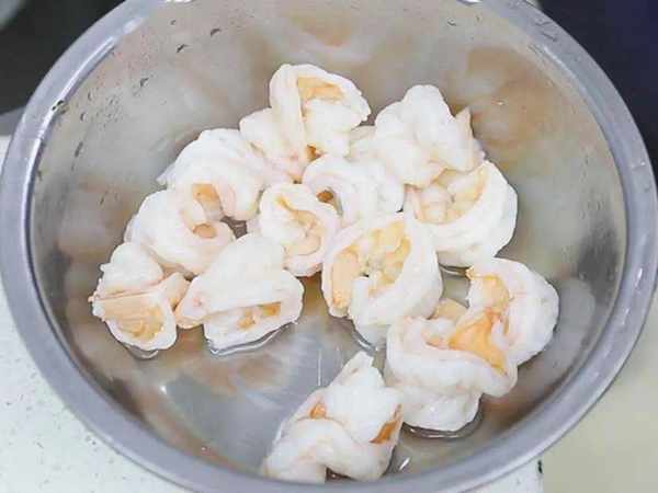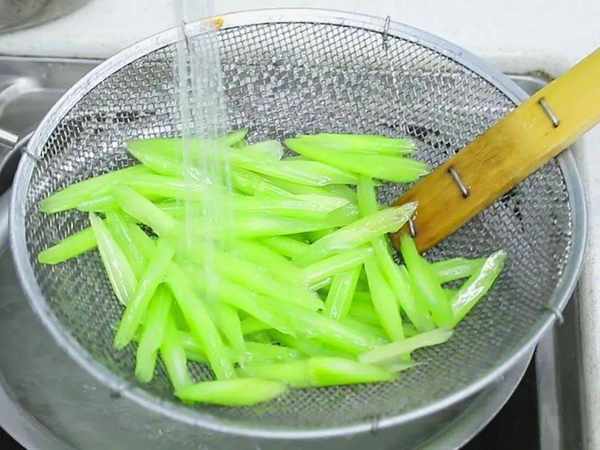 3.锅内烧水,加入少许食盐和植物油,把芹菜段倒进去快速焯煮一下,大约20秒钟,芹菜返青以后立即捞出,快速用凉水清洗几下,保持清脆的口感;继续把水烧开,把虾仁煮一下,虾仁比较嫩稍微烫至变色定型就熟了,把它捞出来用凉开水冲洗一下,这样肉质更加的紧实滑嫩。