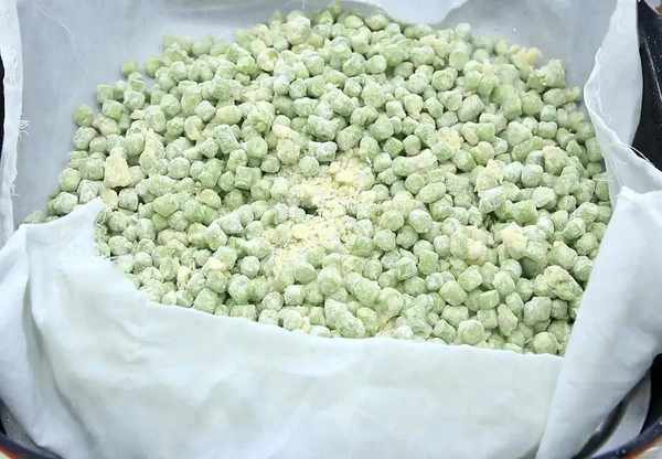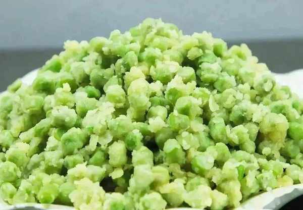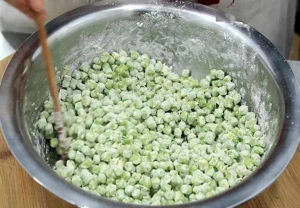 1.准备一把洗干净的长豆角,晾干水分以后切成碎粒放入盆中,打入一个鸡蛋搅拌均匀,再放入适量的面粉继续搅拌,让豆角表面均匀裹上面粉,像这样一粒一粒散开,不粘连的状态就可以了,再淋入一点植物油,加入食盐2克再次拌匀。