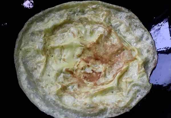 3.锅内烧油,充分滑锅,烧热以后倒出热油,直接倒入一半鸡蛋液,轻轻转动锅,利用余温把鸡蛋液铺成圆形的鸡蛋饼,定型以后沿着锅边淋一圈植物油,淋植物油能使蛋饼脱离。