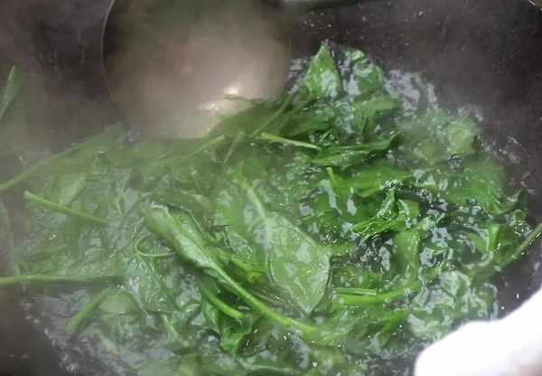 2.锅内烧水,加入少许食盐和植物油,让菠菜色泽更加鲜亮,防止营养流失,水烧开以后放入洗净的菠菜,焯水能够减少菠菜中的草酸,菠菜断生后倒出来,用清水冲洗,冷却控水。