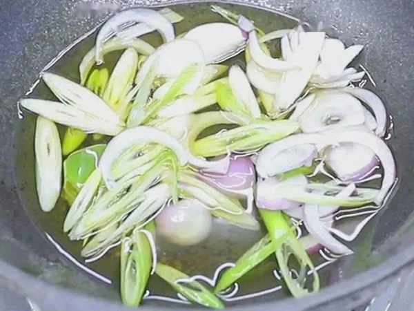 4.锅内多烧一些油,凉油时放入洋葱和葱丝,开小火慢慢炸,葱香味出来以后淋入一点高度白酒,有利于葱香味的充分释放,炸至原料微微焦黄,把炸好的葱油倒出来,挑出洋葱和葱丝不要,放在一边稍微冷却一下。