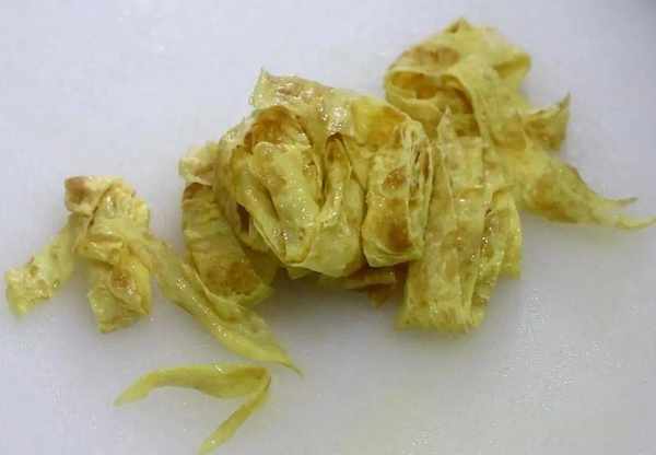4.鸡蛋饼周围翘起时翻面,把另一面也煎黄煎定型即可出锅,把煎好的蛋饼叠起来,切成宽条备用。