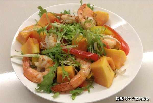 原料:红、黄灯笼椒半个;35毫升白醋;三分之一的木瓜;南美白对虾12只;苦菊花适量;100毫升橄榄油;少许切碎的欧芹;少许混合香料;少许白胡椒