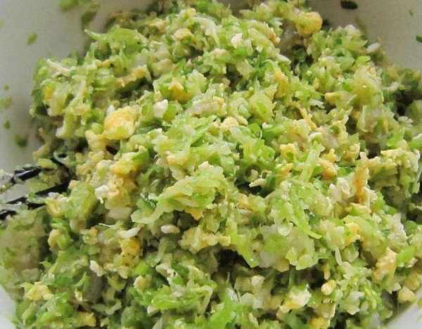 第五步:将切碎的黄瓜和打碎的鸡蛋放入碗中,倒入适量的食用油、香油和盐,搅拌均匀成块状馅料。