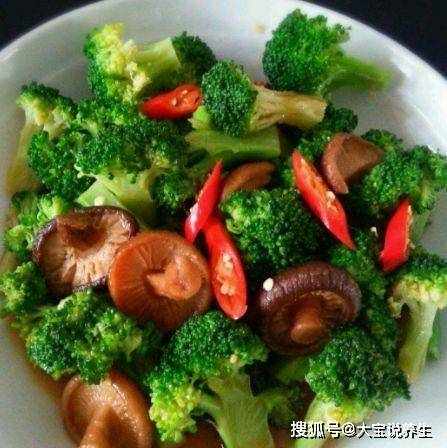 4.将西兰花在盘子里围成一圈摆好,锅中倒入适量的油烧热,加入香菇翻炒至变色。