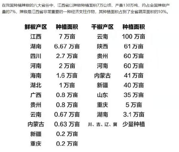 江西人的无辣不欢,从这张表里可见一斑,全国种植辣椒面积排名,江西省以7万亩位居全国第一!超过了湖南、四川、贵州等南方省份。