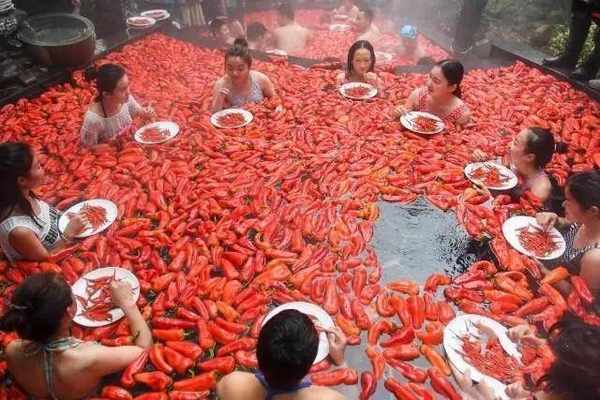 前两年,江西省宜春市曾举办“全国吃辣椒大赛”,来自江西、湖南、四川各地的上百名挑战者们,沉浸在放满辣椒的温泉中,进行吃辣比赛!
