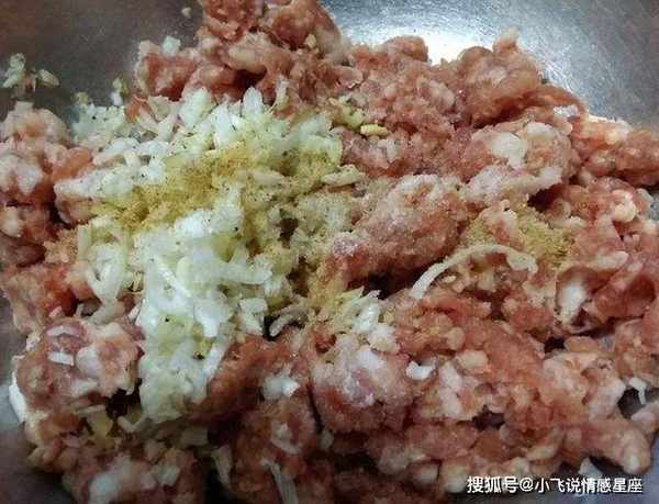 第二步:猪肉剁成肉末,葱花切碎,将肉末和葱花放入碗中,倒入适量的花椒粉和酱油,拌匀后腌一会。