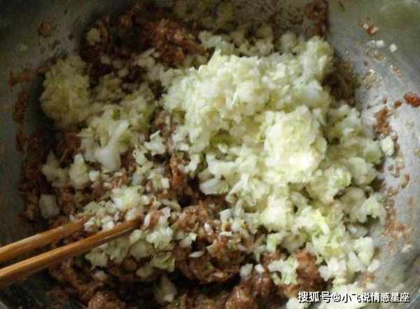 第四步:最后将白菜倒入肉馅中,加入适量的食用油、香油和盐拌匀成光滑的饺子馅。