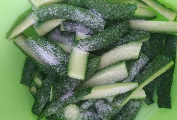 2、将切好的黄瓜放入容器中,加盐杀水;