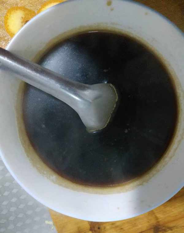 5、锅烧热,加入三分之一的醋,三分之二的生抽,上色用的老抽少许,白糖一勺,将以上材料烧开放凉待用;