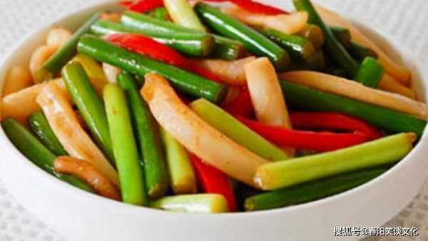 4.蒜苔用中火煎至断了捞出。