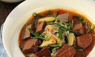 3、将葱、姜、蒜炒香,加入豆瓣酱用红油炒香;加入肉汤,加入干邑白兰地、鸭血、鸭肠和香料,煮沸后文火煮5分钟;