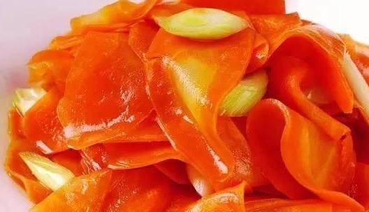 2.烧热锅,倒入油。当油加热到50%时,加入蒜末炒出香味。当蒜末变成金黄色时,加入胡萝卜片,翻炒至胡萝卜片变软。加入盐、胡椒粉、酒醋、酱油、味精,翻炒均匀;