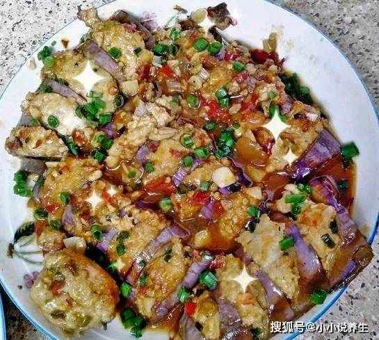 9、锅内放少许油,下入炸好的茄子,加少许水将茄子煮透,加少许酱油调味,撒上青红椒和小葱粒。最后,倒入煮沸的玉米水勾芡。