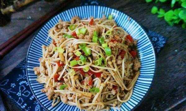 原料:金针菇300克,花椒2勺,肉末100克,酱油2勺,盐1克