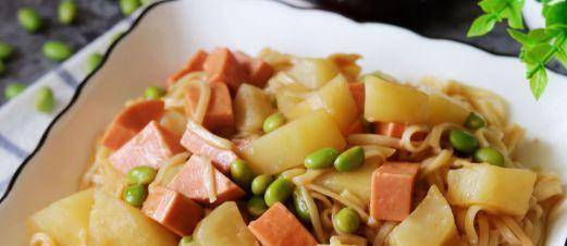 7、加2勺生抽和1勺盐,大火烧开汤汁,转小火盖上锅盖,让面条焖熟。8、锅里汤少的时候,用筷子搅动面条,这样面条和土豆火腿更入味。当汤变得比较干时,就可以出锅了。
