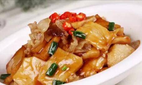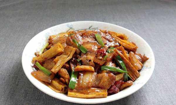 锅烧至80度热,放入蒜头爆香,再放入猪肉炒至微黄,再放入腐竹,大火炒熟,加盐、味精、酱油调味