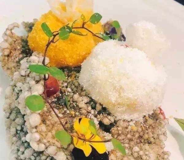 原料:土豆粉100克,培根片30克,三文鱼30克,牛油果1个,西米鱿鱼片1片,三色紫罗兰3个,柠檬1个,椰子50克,黄面包屑50克,香草15克芝士粉