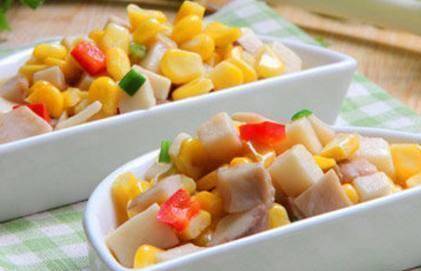 2.将青椒和胡萝卜洗净切丁,大蒜去皮切片。3.将甜玉米解冻备用。