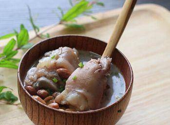5、猪脚放入锅中,加入适量水,置火上烧开,煮半小时左右,撇去浮油,加入香菇、姜丝、精盐,小火慢炖大概有小火20分钟,然后加入丝瓜、豆腐,炖至猪脚熟透,加入味精调味