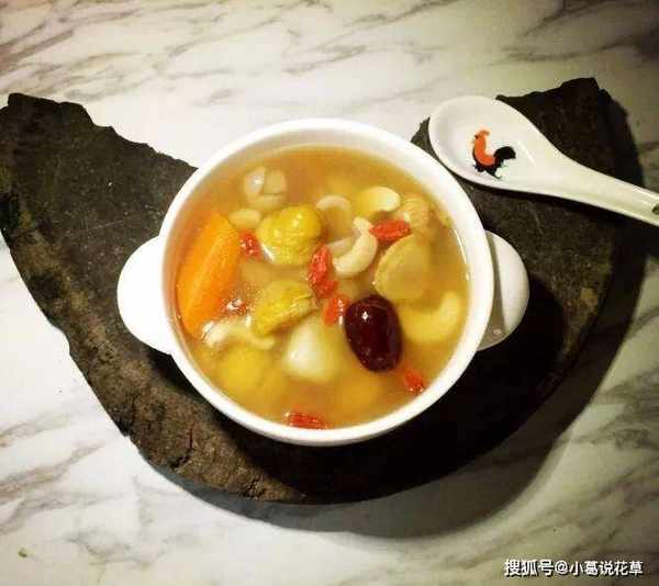 原料:腰果100克、栗子100克、胡萝卜1根、辣根5根、山药1根、红枣、无花果各5颗、枸杞、龙眼各适量、蜜饯1个