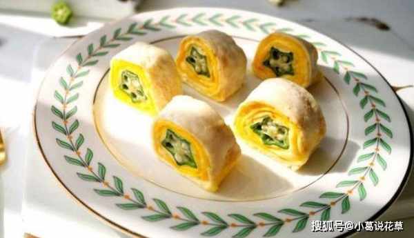 5、在蛋黄饼上抹一层沙拉酱,把秋葵放在蛋黄饼上,卷起来。