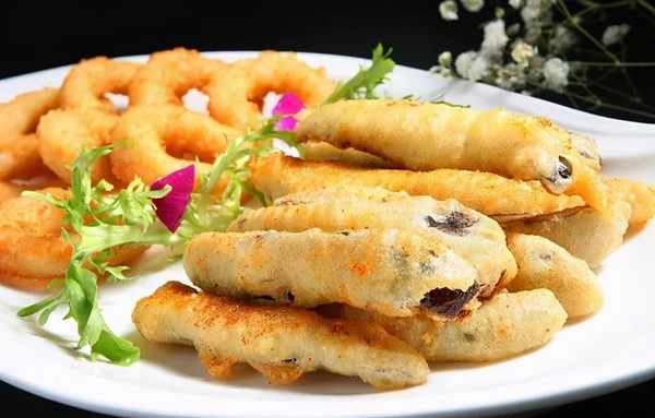 3、挂好酥糊酿辽参,下60度热油锅炸至金黄酥脆,捞出,油温调高,回锅再炸,捞出检油,撒上七味盐,装盘。