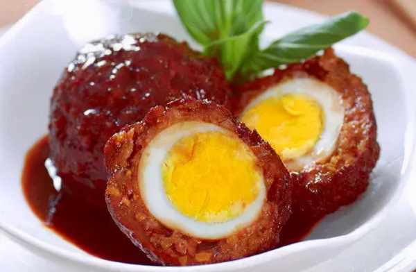 2.将去皮的水煮蛋包在肉馅里,做成5个大丸子。