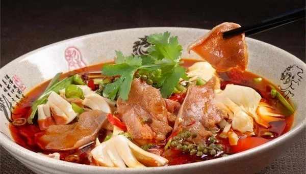 3.锅洗净,加红汤烧开,放入猪舌片、猪颈肉片,加入蚝油、鸡精、鲜胡椒粉、青辣椒圈和花椒油煮熟,装碗放在配料上.另取一锅,放油烧热,加入干青花椒炒香,淋在碗中的菜上即可食用。
