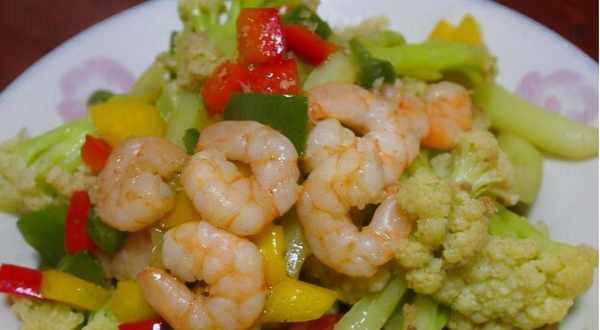 材料:花菜1个,虾仁8只,郫县豆瓣适量,花椒适量。