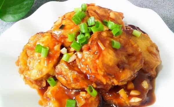 9.搅拌均匀后,将酱汁倒在茄盒上,撒上葱花即可。