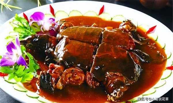 3、龟块收干后,加入酱油、精盐、姜丝,翻炒几下,加入料酒,盖上文火煮一会,加入汤汁,改用小火煮至酥脆。谷氨酸和切碎的大蒜,炒几分钟。盛入盘中,淋上香油,撒上胡椒粉即可食用。
