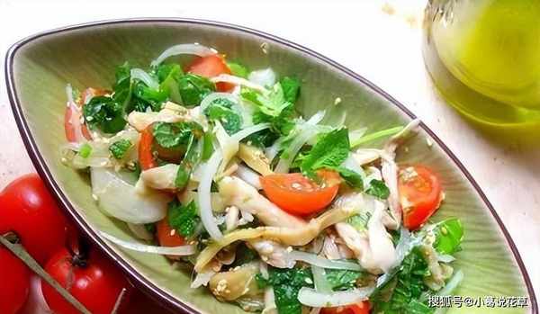 这道薄荷酸辣鸡丝采用新鲜薄荷带来清新明快的香气,搭配酸辣酱和炸芝麻,口感混合、和谐、清新。