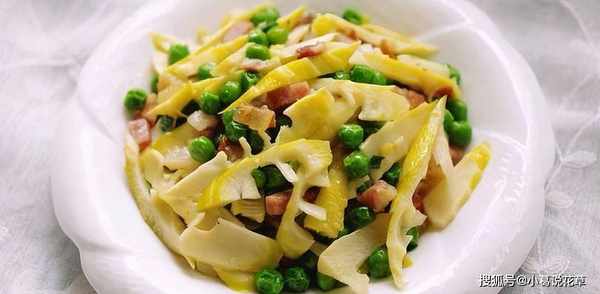 材料:春笋200克,腊肉一块,青豆200克,高汤1汤匙,油少许