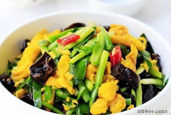 材料:韭菜、木耳、土鸡蛋、植物油、盐、糖
