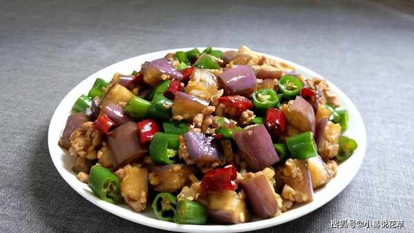 材料:瘦肉60克,紫茄子2条,青椒6个,辅料:生姜2片,蒜2瓣,干辣椒6个,盐2克,鸡粉2克,生抽2勺酱油