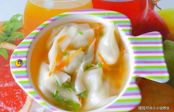 第14步,锅中烧开水,加入少许盐和香油,放入馄饨略煮,然后加入切碎的胡萝卜煮2分钟(比煮饺子的时间要短)