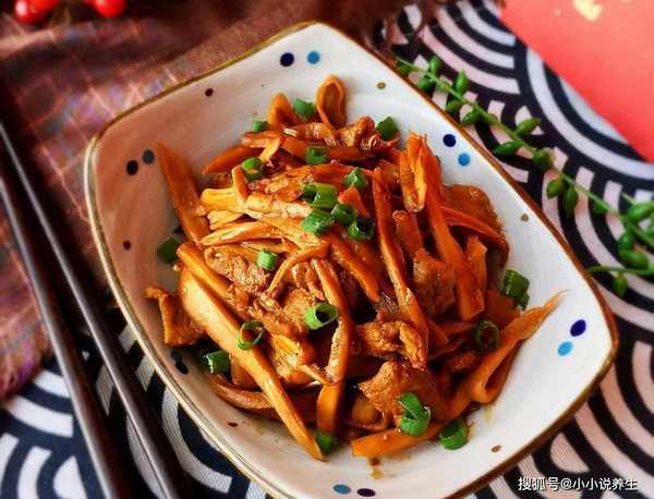 锅烧热,放入肚皮炸至金黄色,装盘,沥去多余的油,起火,放入肚皮、腐竹、蒜苔炒熟加酱油、盐、鸡精和少许水,将切碎的蒜放入锅中,盖上锅盖,关中火煮三分钟
