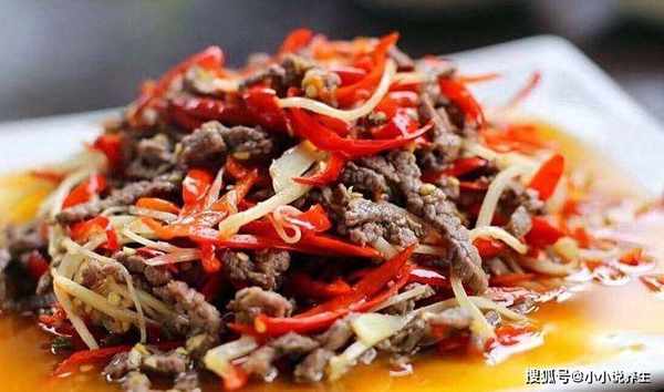 原料:牛肉、料酒、花椒、盐、淀粉、青红椒、大葱、黄米椒、泡姜