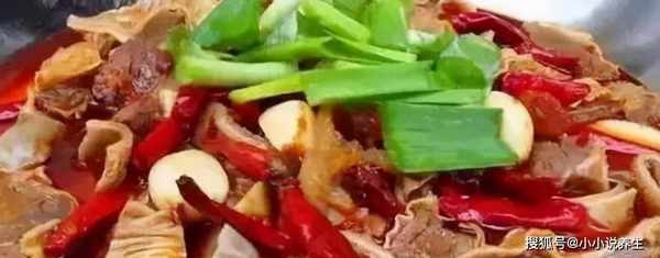 3、将800克菜籽油和200克黄油放入平底锅中,加热至60%的热量。加入100克姜片、桂皮、八角炒香。逐渐加入牛内脏、牛腩和30克辣椒王小米。白酒300克去腥,加豆瓣酱、辣妹子各50克,麻辣鲜神麻100克,大火炒,提色增香。