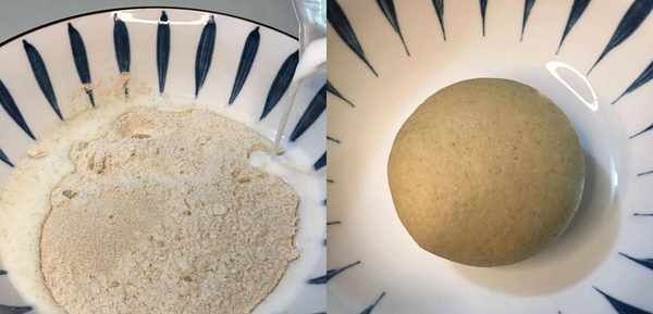 1.碗中倒入全麦粉和准备好的酵母粉,再倒入80毫升的温牛奶,搅拌成面絮状后再揉成光滑的面团,然后盖上保鲜膜醒发1个小时。